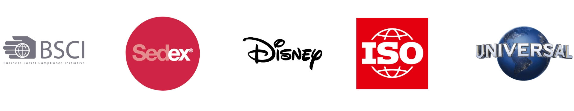 We has been approved by Disney and has obtained certifications from FAMA, ISO 9001, SEDEX, BSCI, as well as passed retailers’ internal audits. Click HERE to see our Certificates
