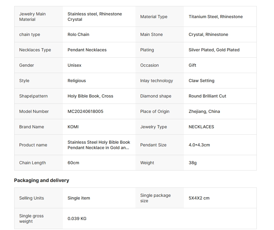 Be the first to review “KOMI Religious Holy Bible Book Pendant Necklace for Women Gold Plated Stainless Steel Rhinestone Holy Bible Necklaces for Girls”