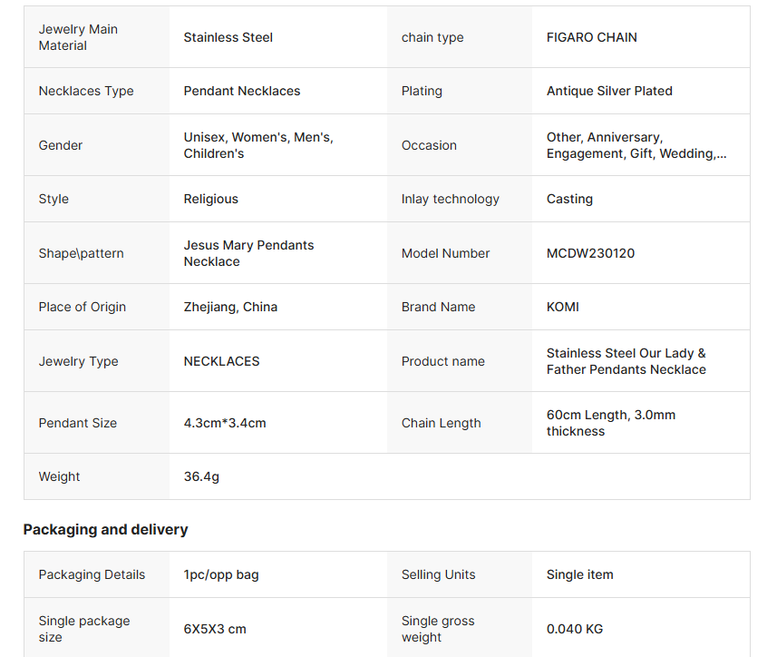KOMI Wholesale Titanium Steel Our Lady of Jesus Pendant Necklace Men’s Stainless Steel Necklace Gothic Pendants Necklaces
